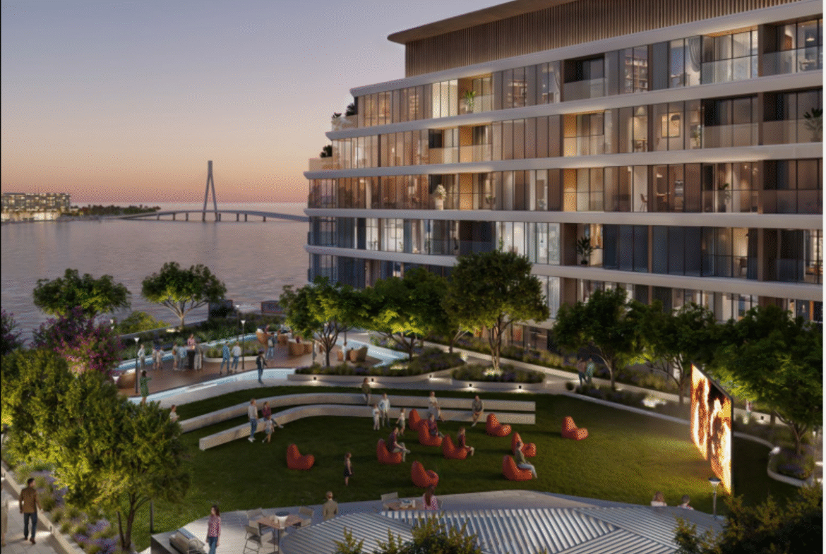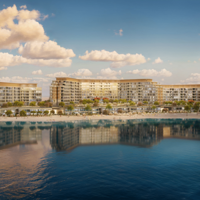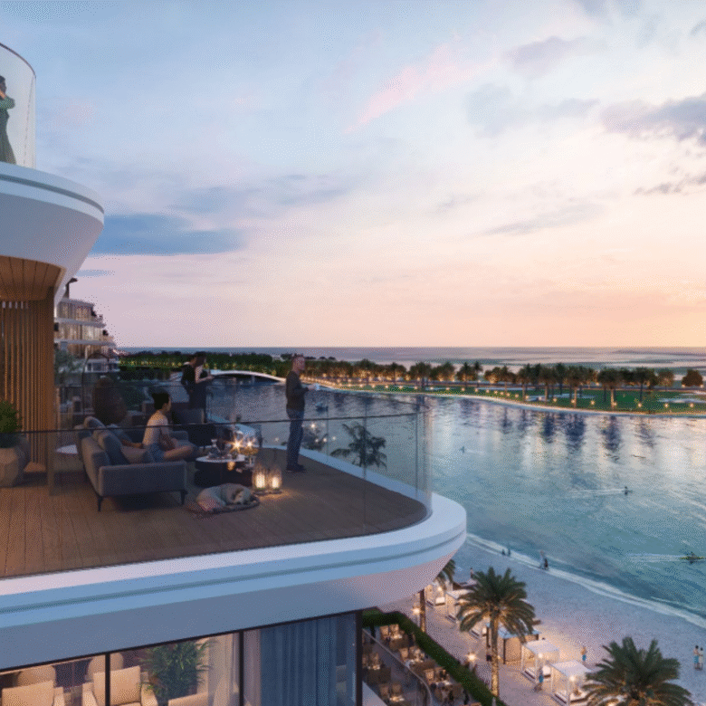 Aquamarine Beach Residences provide refined seafront living with panoramic views, soft white sands, and access to lush mangroves. The development features an 18-hole golf course, luxury resorts, a helipad, and a private yacht club.